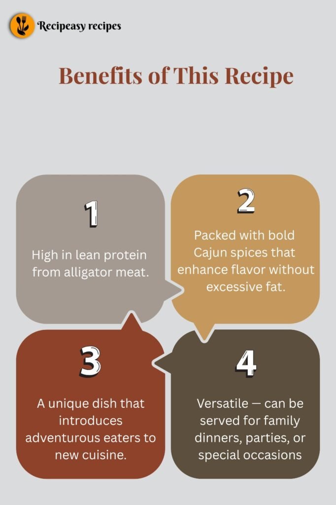 This dish is perfect if you’re looking to impress your guests or explore new flavors at home. It’s comforting yet adventurous, offering the deep Cajun spices that warm the soul. Plus, the ingredients are simple to find in most stores, and even if you substitute alligator with chicken or shrimp, you’ll still get that authentic Louisiana flavor.
