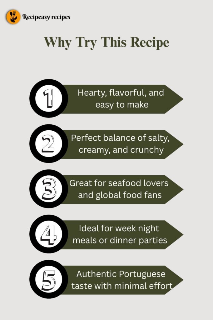 You’ll love this recipe because it’s hearty, flavorful, and surprisingly easy to make. Whether you’re a seafood lover or someone exploring global cuisines, Bacalhau à Brás offers a comforting balance of saltiness, creaminess, and crunch. It’s also versatile perfect for dinner parties or weeknight meals. The best part? You can prepare it with minimal effort and still impress your guests with authentic Portuguese taste.