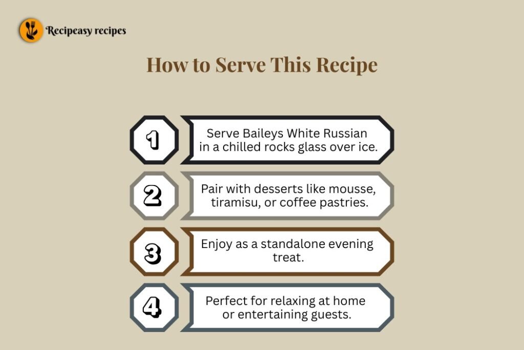 Serve your Baileys White Russian in a chilled rocks glass over ice. It pairs beautifully with desserts like chocolate mousse, tiramisu, or coffee-flavored pastries. The cocktail can also be enjoyed on its own as a luxurious evening treat, perfect for relaxing at home or impressing guests at a gathering.