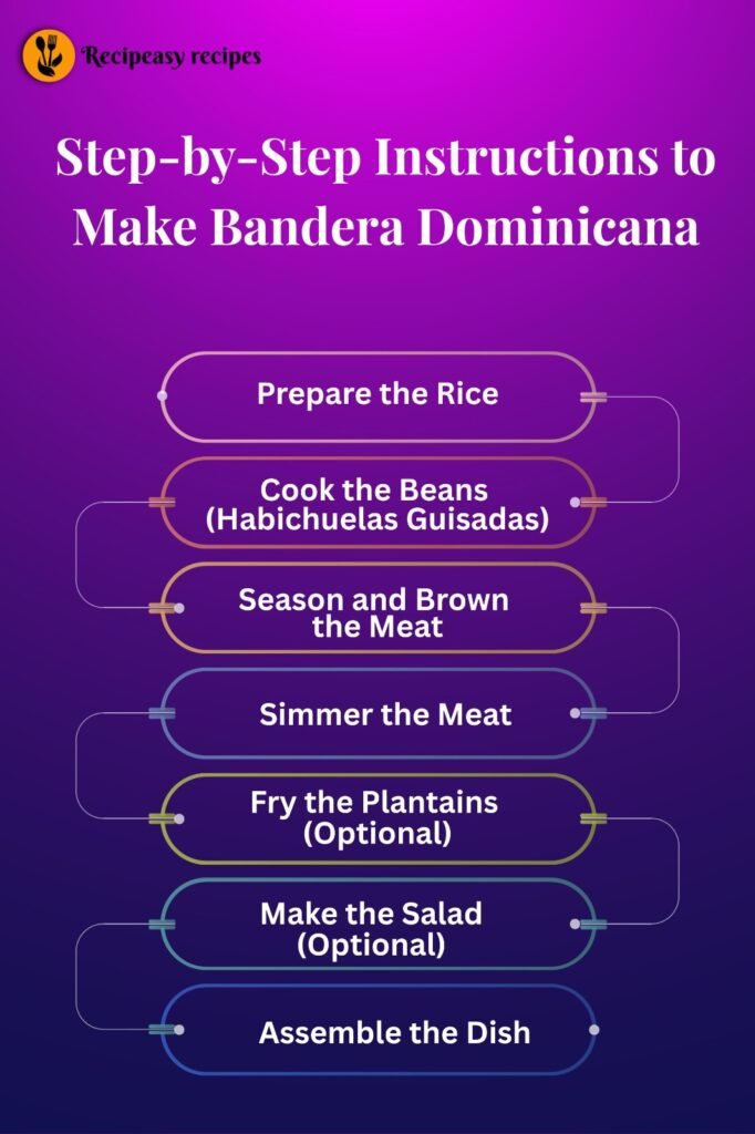 The Bandera Dominicana recipe refers to a traditional Dominican meal consisting of white rice, stewed beans (habichuelas guisadas), and a serving of meat such as chicken, beef, or pork. Often accompanied by a fresh salad and crispy fried plantains, this comforting dish offers a balanced and satisfying meal. The name “Bandera,” meaning “flag,” signifies its cultural importance in Dominican households.