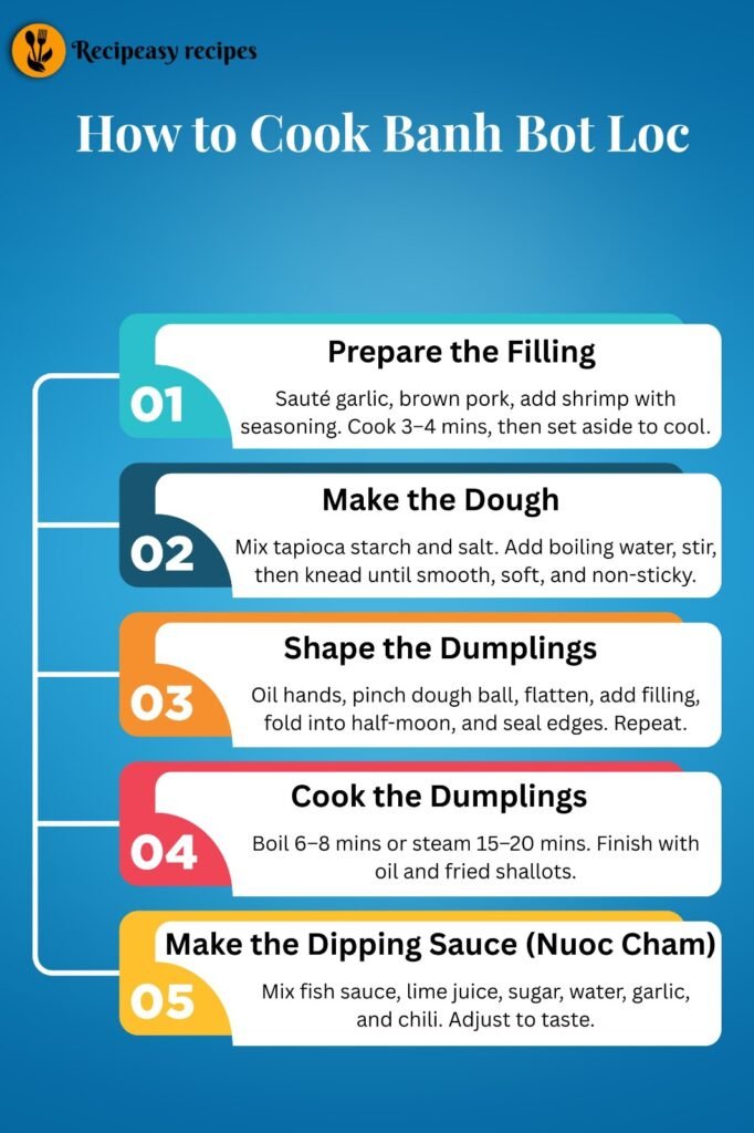 Banh Bot Loc Recipe is a beautiful reflection of Vietnamese tradition chewy on the outside, savory and juicy on the inside. The way the translucent dumpling wraps around flavorful shrimp and pork makes every bite satisfying. It’s a dish that’s full of character, made with love and patience, and perfect for sharing with family or friends.