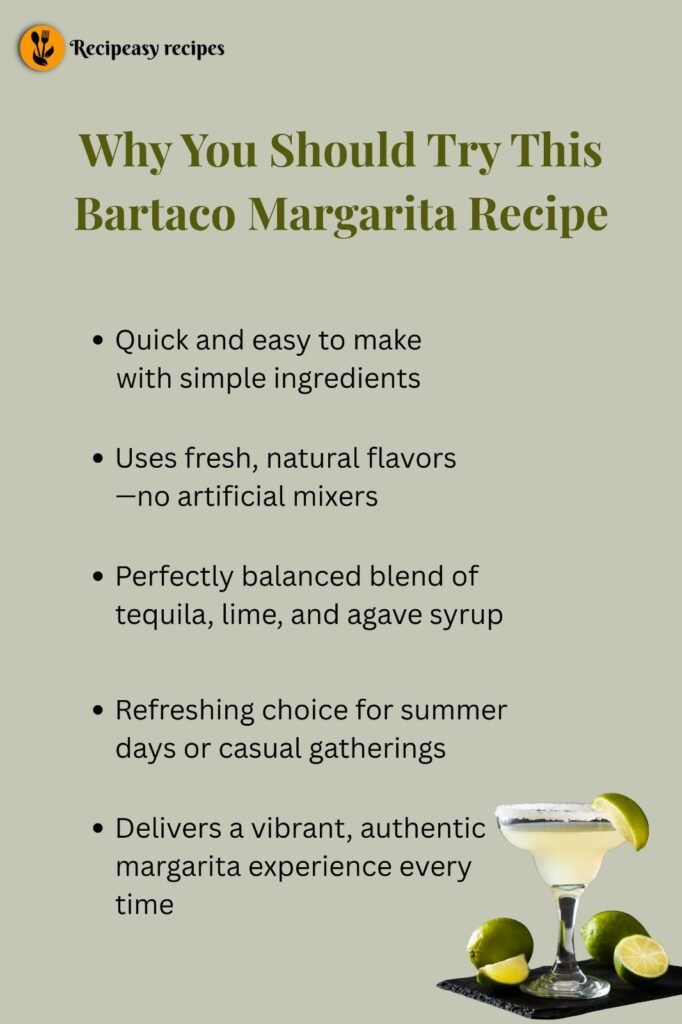 The Bartaco margarita is best enjoyed ice-cold. Serve it either straight up or on the rocks. This drink pairs wonderfully with Mexican dishes like tacos, nachos, or guacamole. It’s perfect for casual gatherings, summer parties, or relaxing at home.