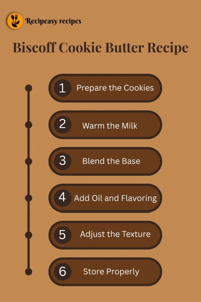 Making Biscoff cookie butter is very straightforward. You start by crushing Biscoff cookies and blending them into fine crumbs. Then, you slowly add warm milk, a little sugar, and oil while blending until everything turns into a smooth, spreadable paste. The key is blending patiently so the mixture becomes creamy and glossy, just like store-bought cookie butter but fresher and more flavorful.